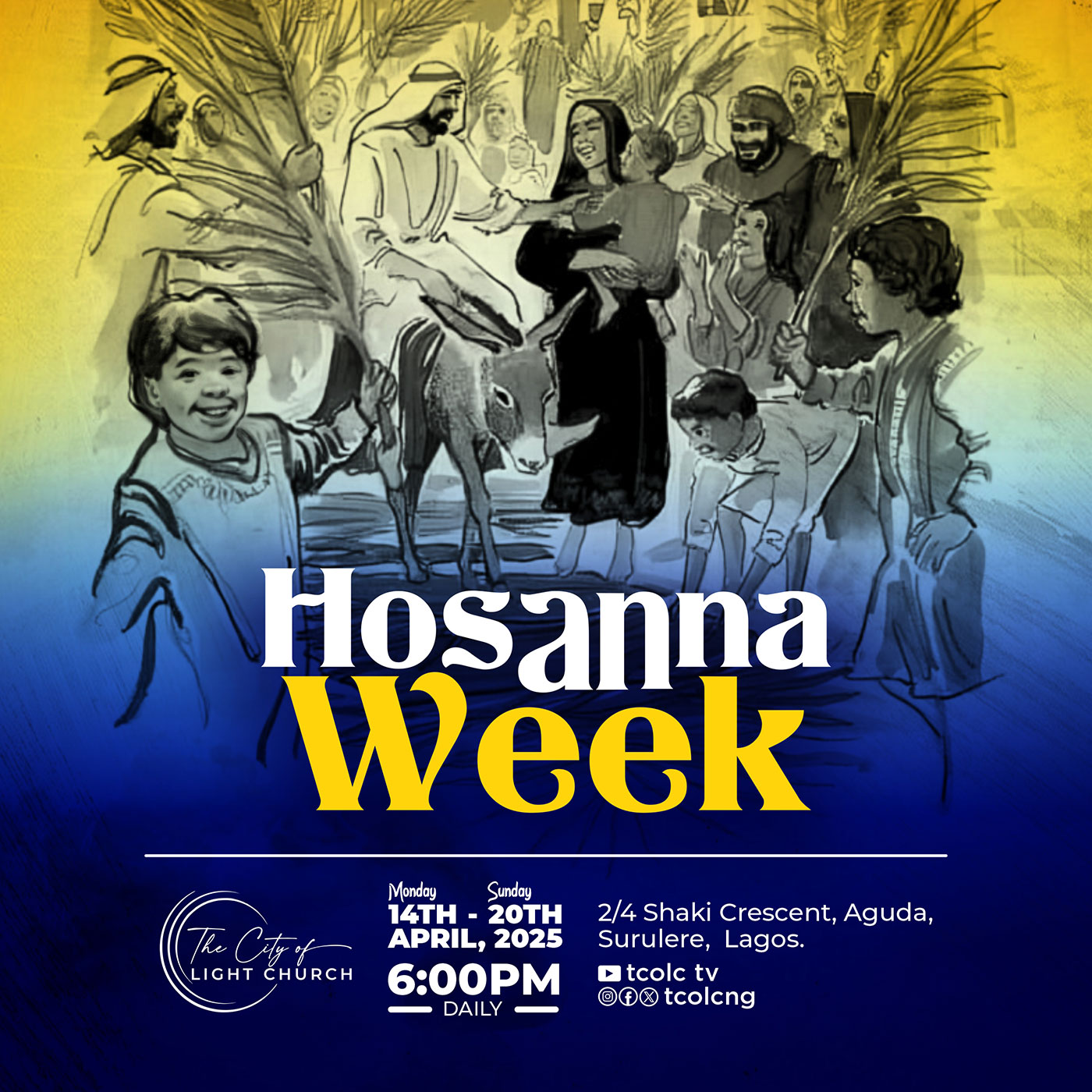 Hosanna Week is our week long praise and worship sessions from Monday, April 14 - Saturday, April 19. The time is 6pm daily. It is going to be a time of refreshing in God's presence.