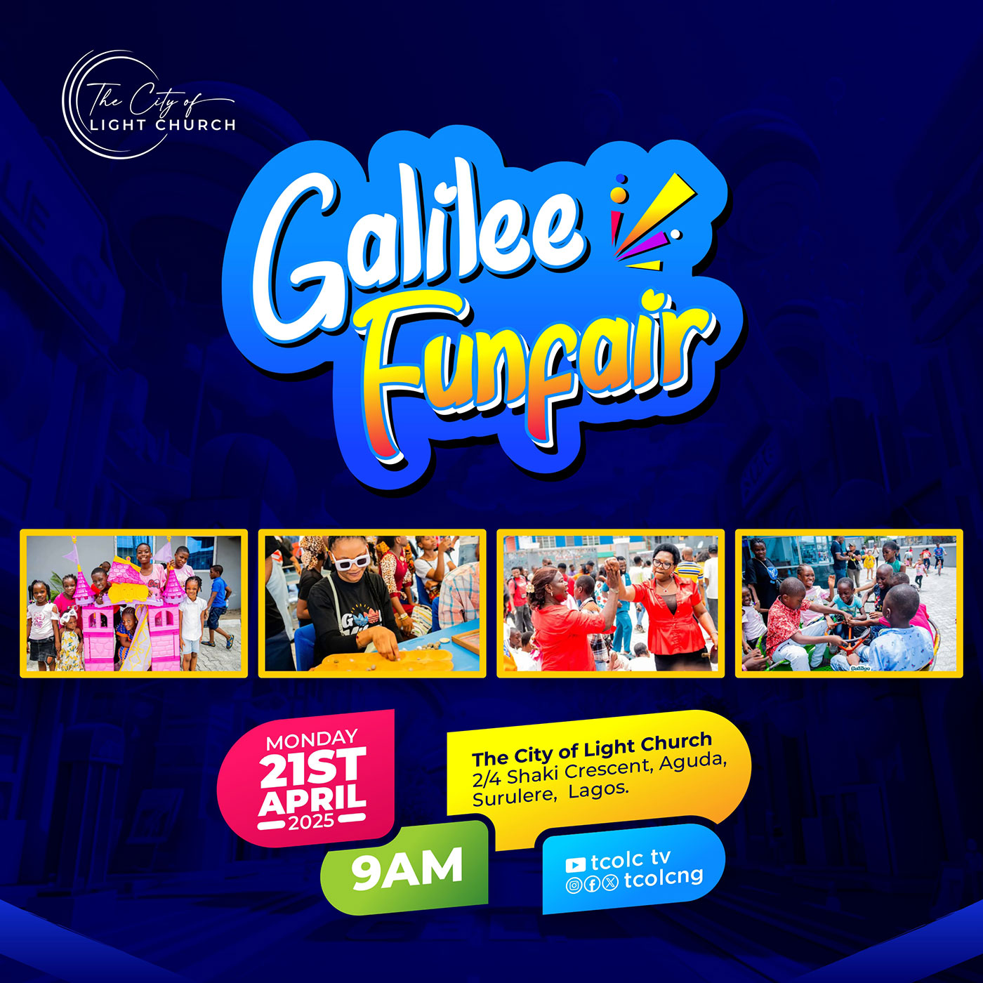 Galilee Funfair - is our annual Easter Monday celebration that provides wholesome experience for every member of the family. We come together to celebrate the resurrection of Christ as we share the message of the cross with people in out immediate church environment. This holds on Monday, April 21, 2025. It starts from 9am